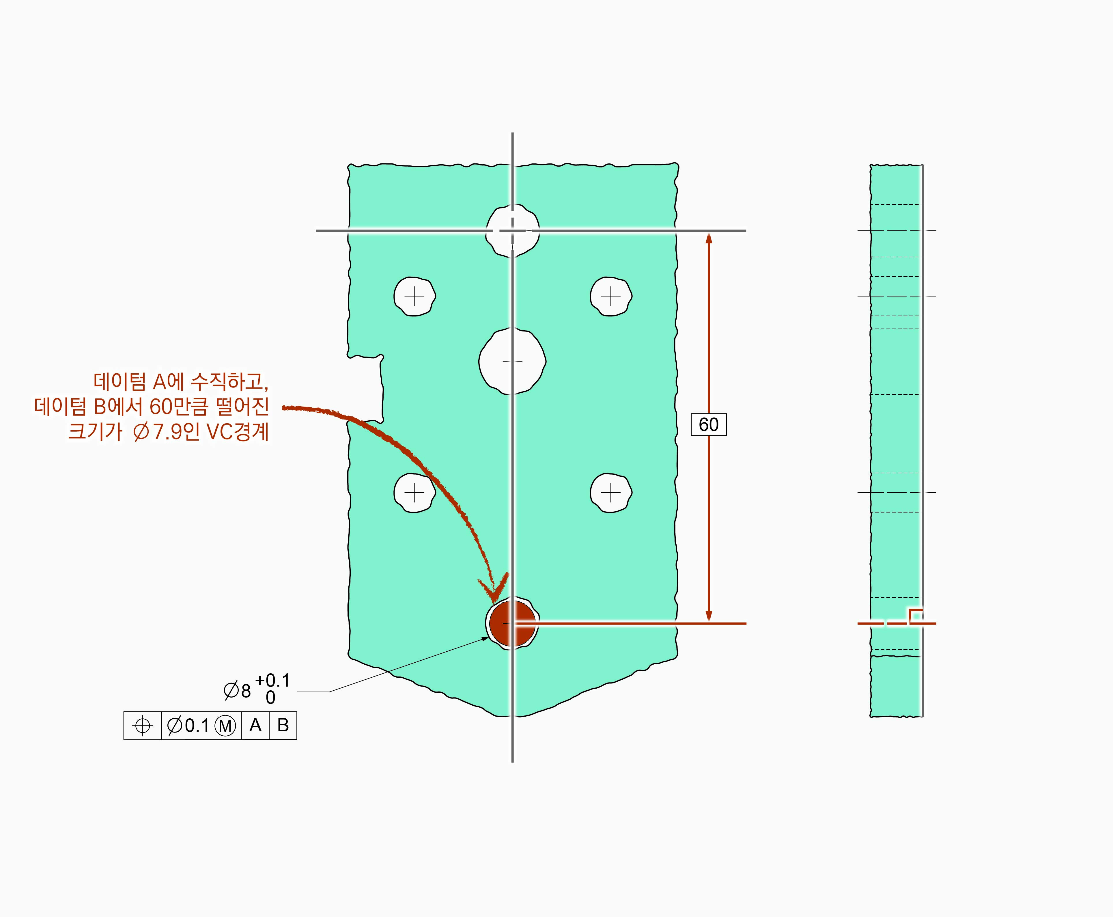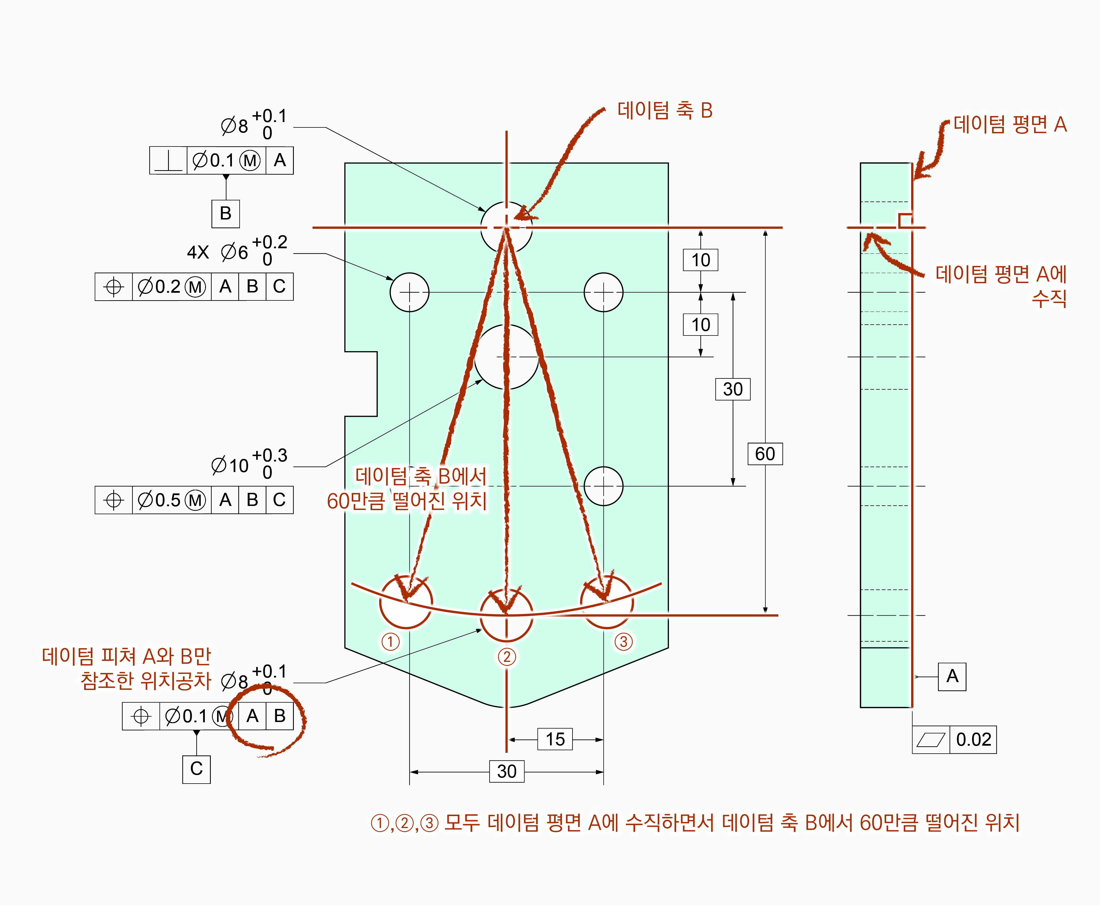 데이텀 피쳐 A와 B만 참조하고 위치공차로 규제된 아래쪽에 위치한 ∅8홀은 데이텀 평면 A에 수직하고 데이텀 축 B에서 60만큼 떨어진 위치에 있기만 하면 된다. 데이텀 피쳐 A와 B만 참조한 경우에는 회전자유도가 하나 남아 있기 때문에 그림에서 ①, ②, ③ 중 어느 위치에 있어도 된다.