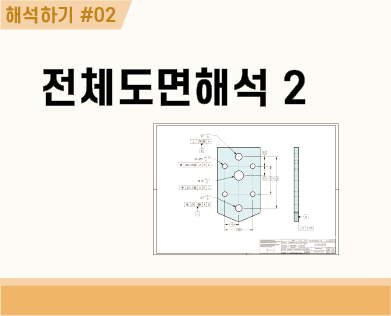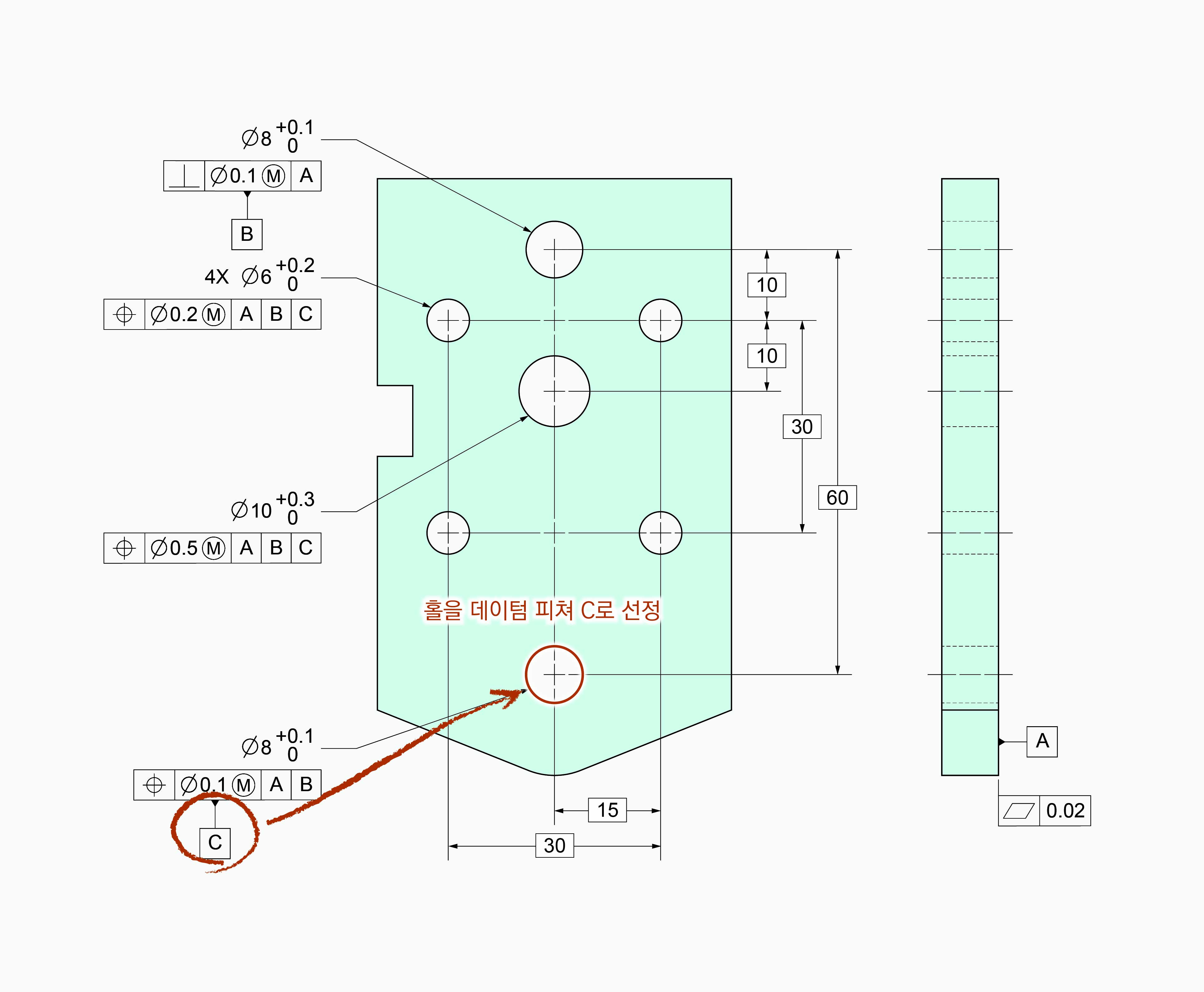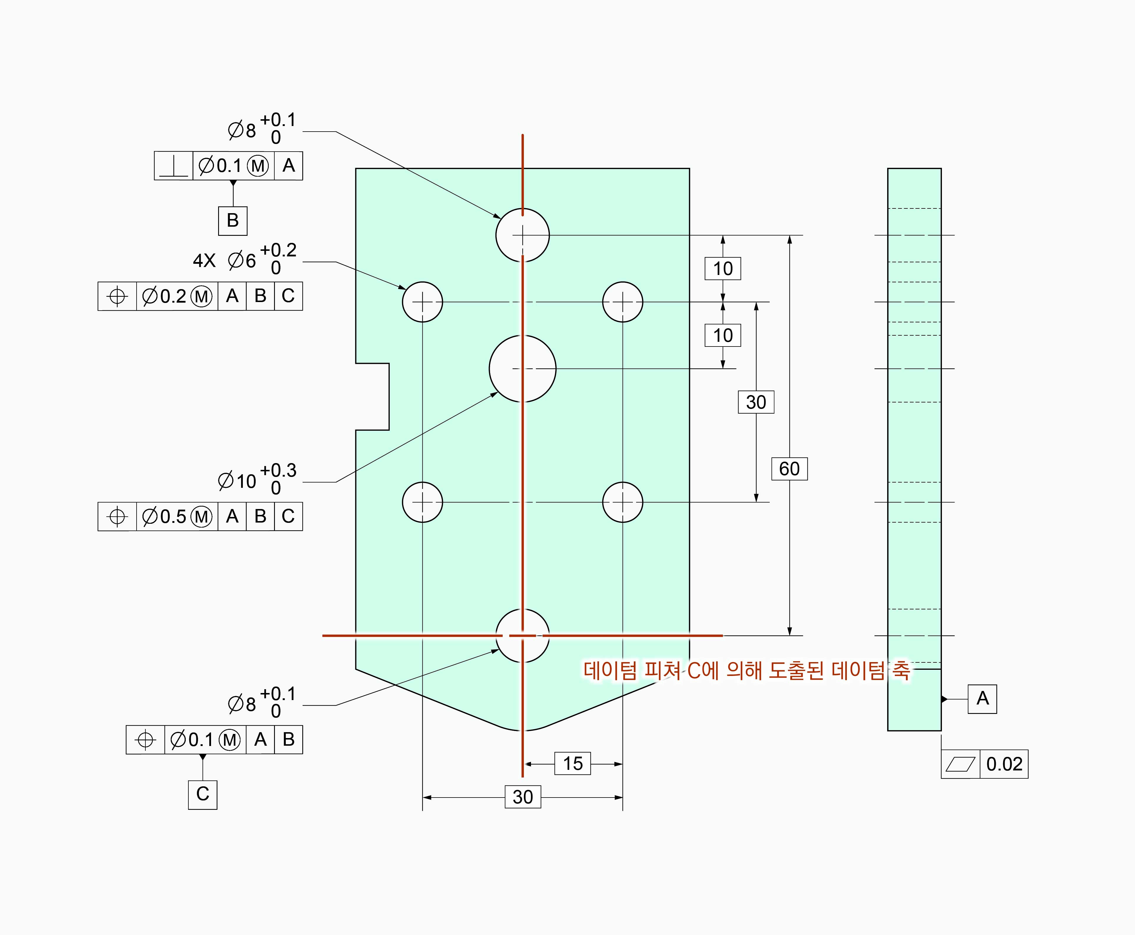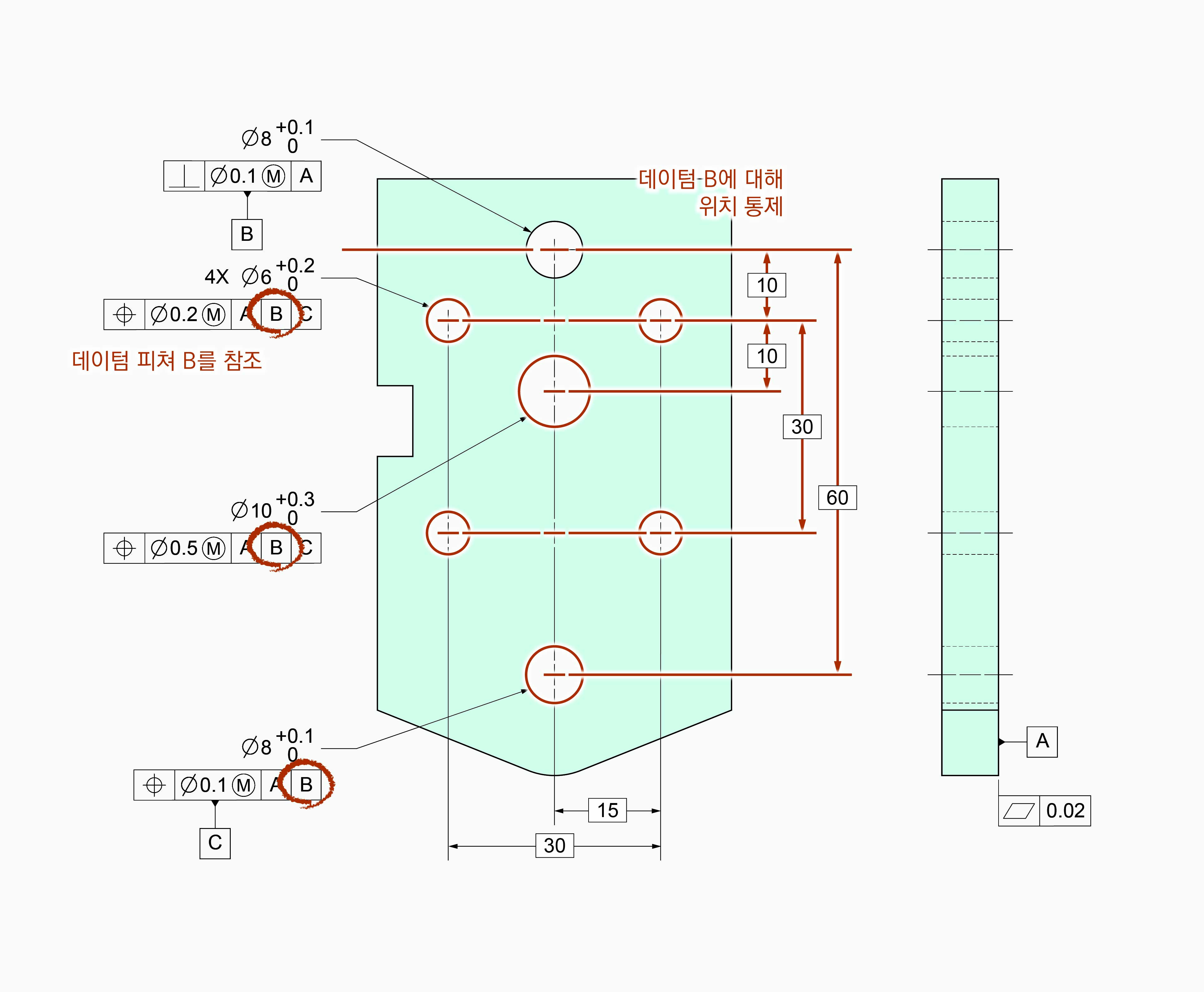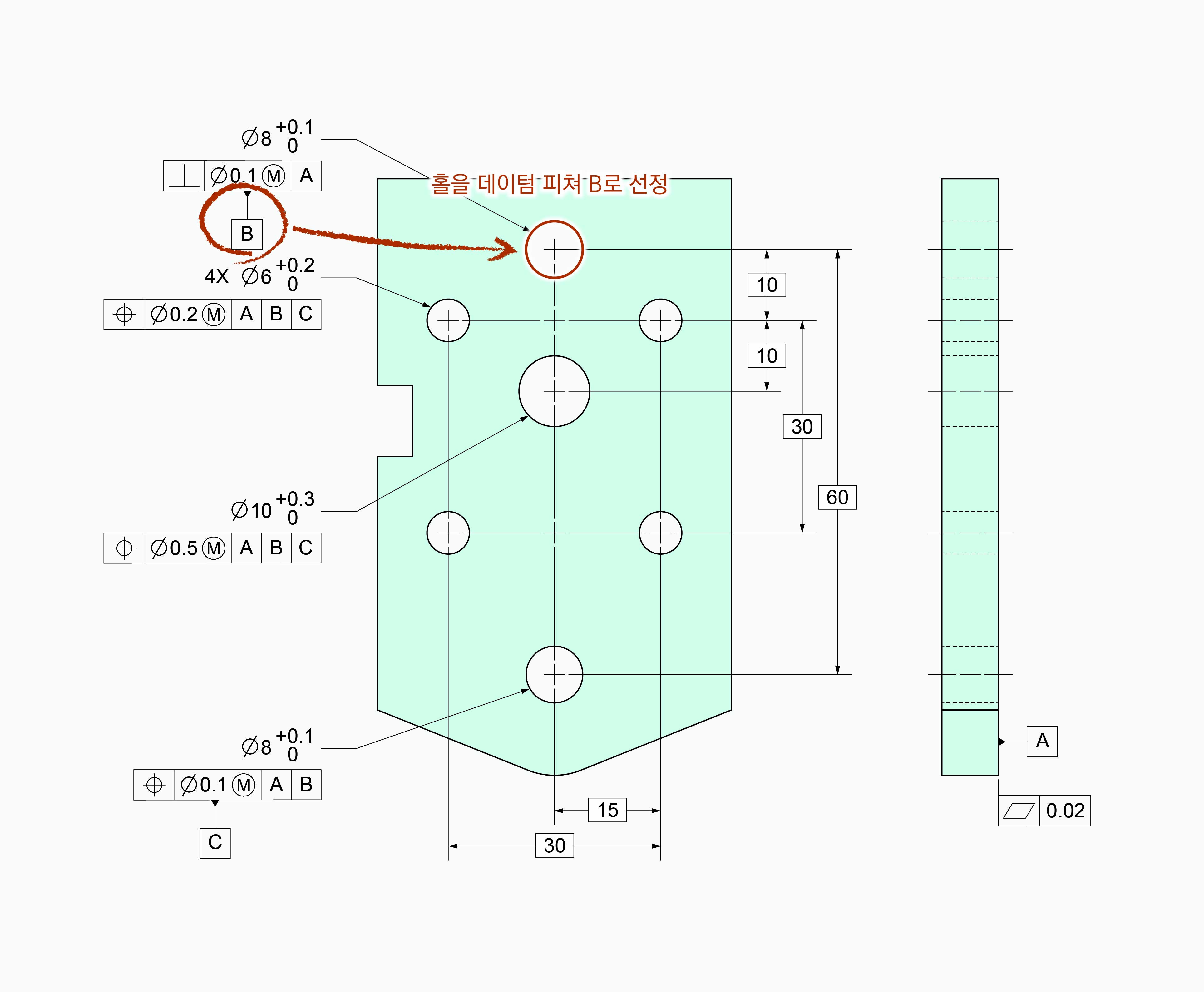 위쪽에 있는 크기가 ∅8인 홀을 데이텀 피쳐 B로 선정하였다. 해당 홀이 데이텀 피쳐로 선정되었다는 것은 기능적으로 중요한 피쳐임을 나타낸다. 아마도 1차 데이텀 피쳐인 피쳐 A 평면에서 다른 파트와 접한 후 피쳐 B 홀에서 볼트와 같은 부품으로 조립될 것이다. 이렇듯 기능을 구체적으로 기술하지 않아도 도면 표기만으로 해당 홀이 기능적으로 중요한지 아닌지 어떤 기능을 수행할 것인지 표현할 수 있다.