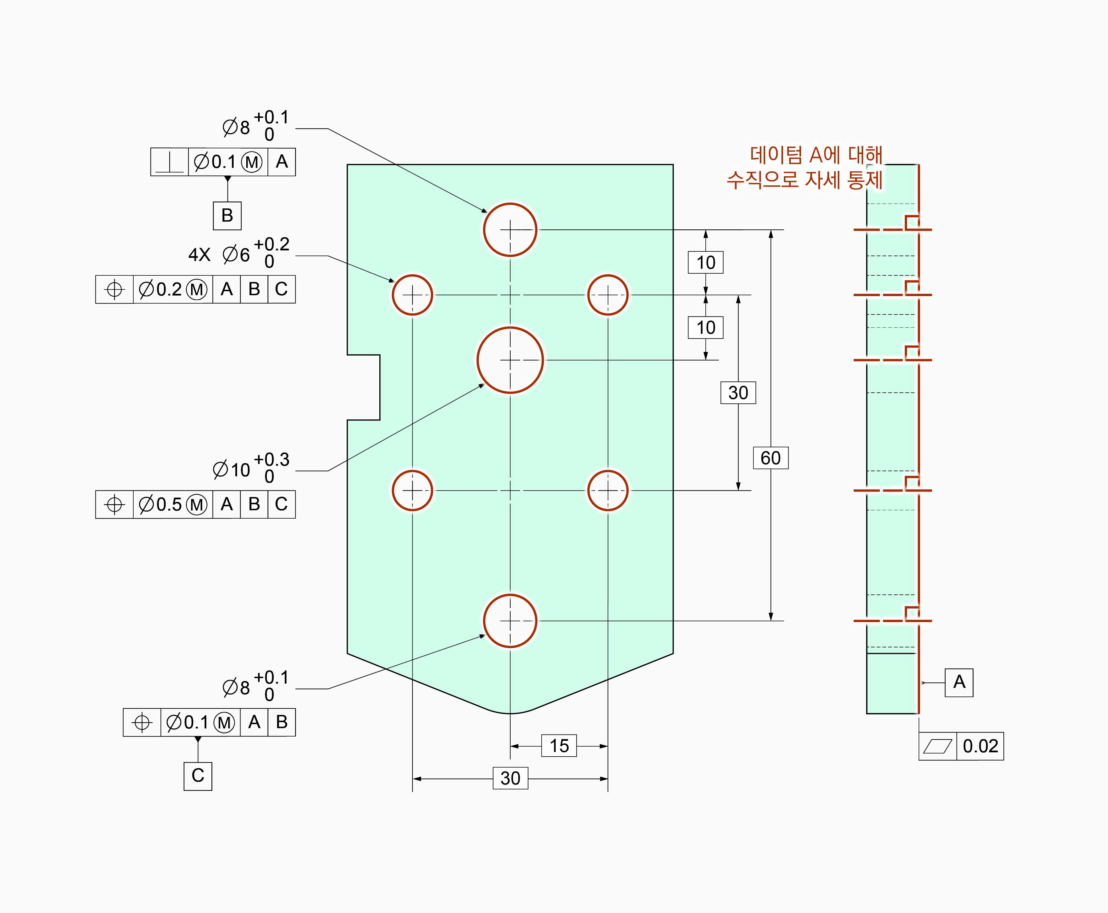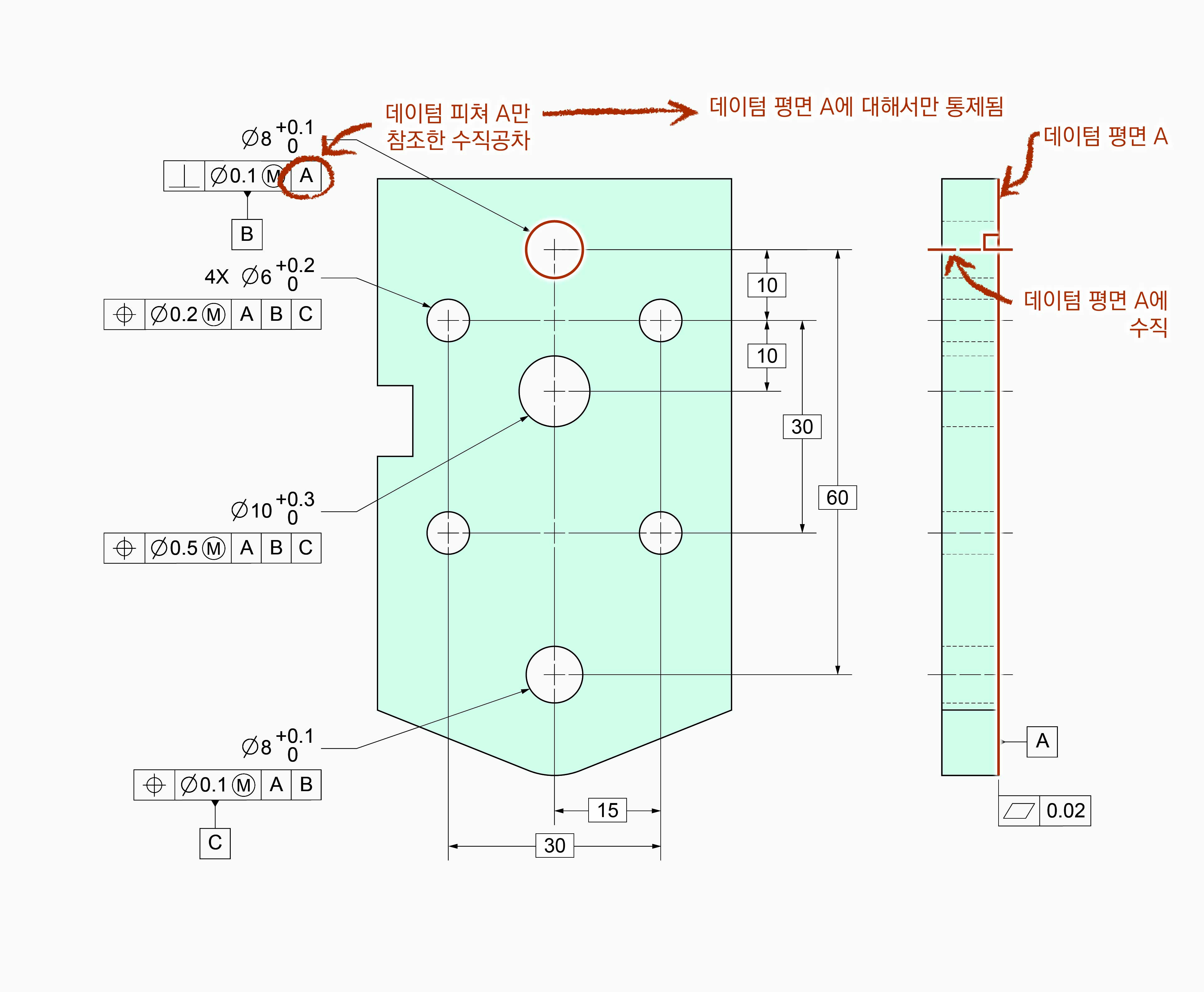 결과적으로 피쳐들은 데이텀 평면 A에 대해 자세가 수직으로 정의되고 이에 대한 요구사항이 생긴다.