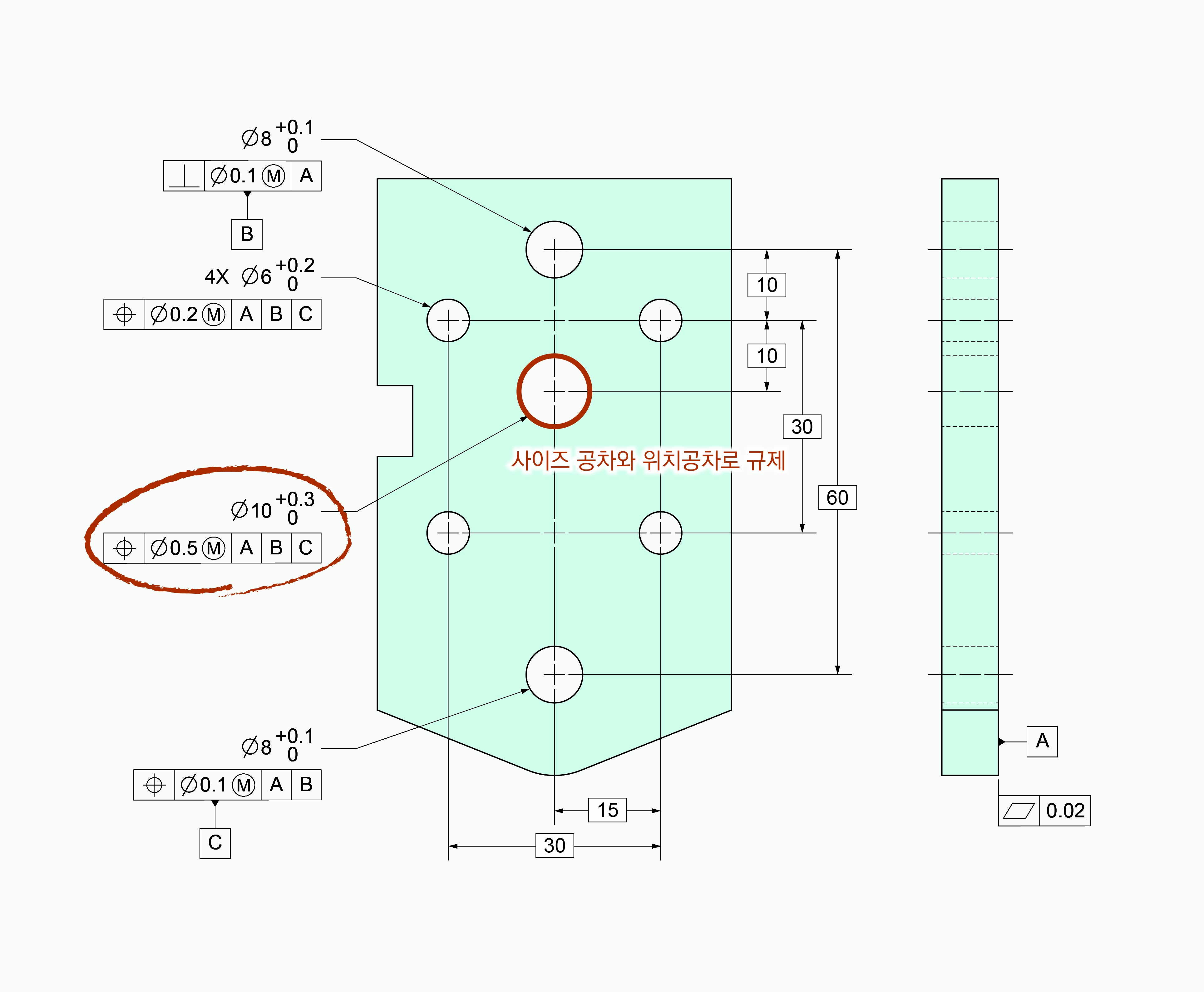 데이텀 피쳐 B를 참조한 피쳐들은 데이텀 피쳐 B의 품질에 영향을 받는다. 따라서 데이텀 피쳐 B를 통제할 필요가 있다. 이를 위해 데이텀 피쳐 B를 수직공차로 규제하고 있다. 홀은 사이즈 피쳐다. 따라서 기하학적 속성 네 개가 모두 통제되어야 한다. 이를 차례로 살펴보자.