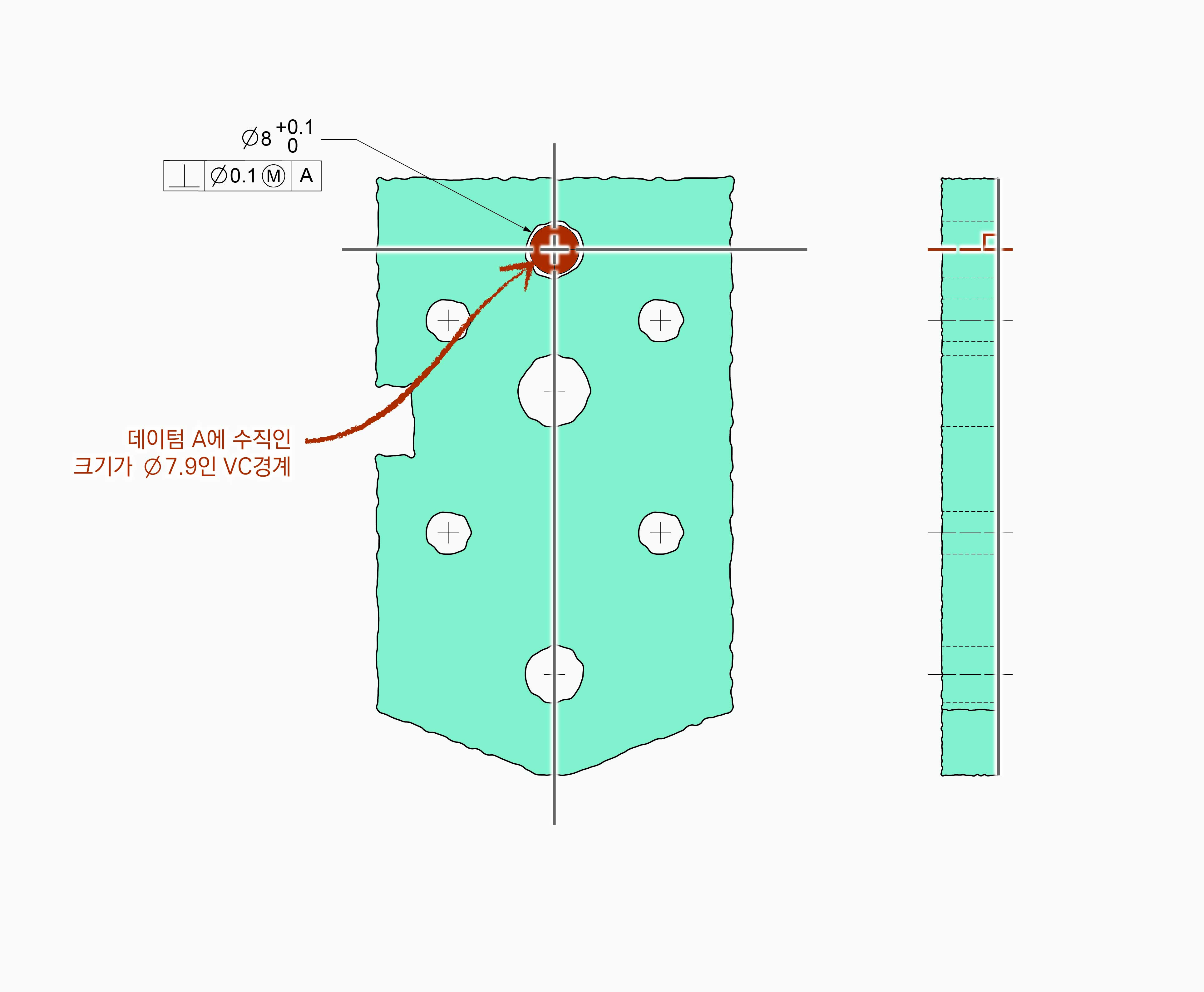 도면의 수직공차는 MMC에서 정의되었기 때문에 중심축이 아닌 서피스 결과가 우선한다. 따라서 중심축을 평가할 필요없이 서피스만 평가하면 되고, 실제 서피스는 데이텀 평면 A에 완벽하게 수직한 상태에 크기가 Ø7.9인 VC경계를 침범하지 않기만 하면 된다.
