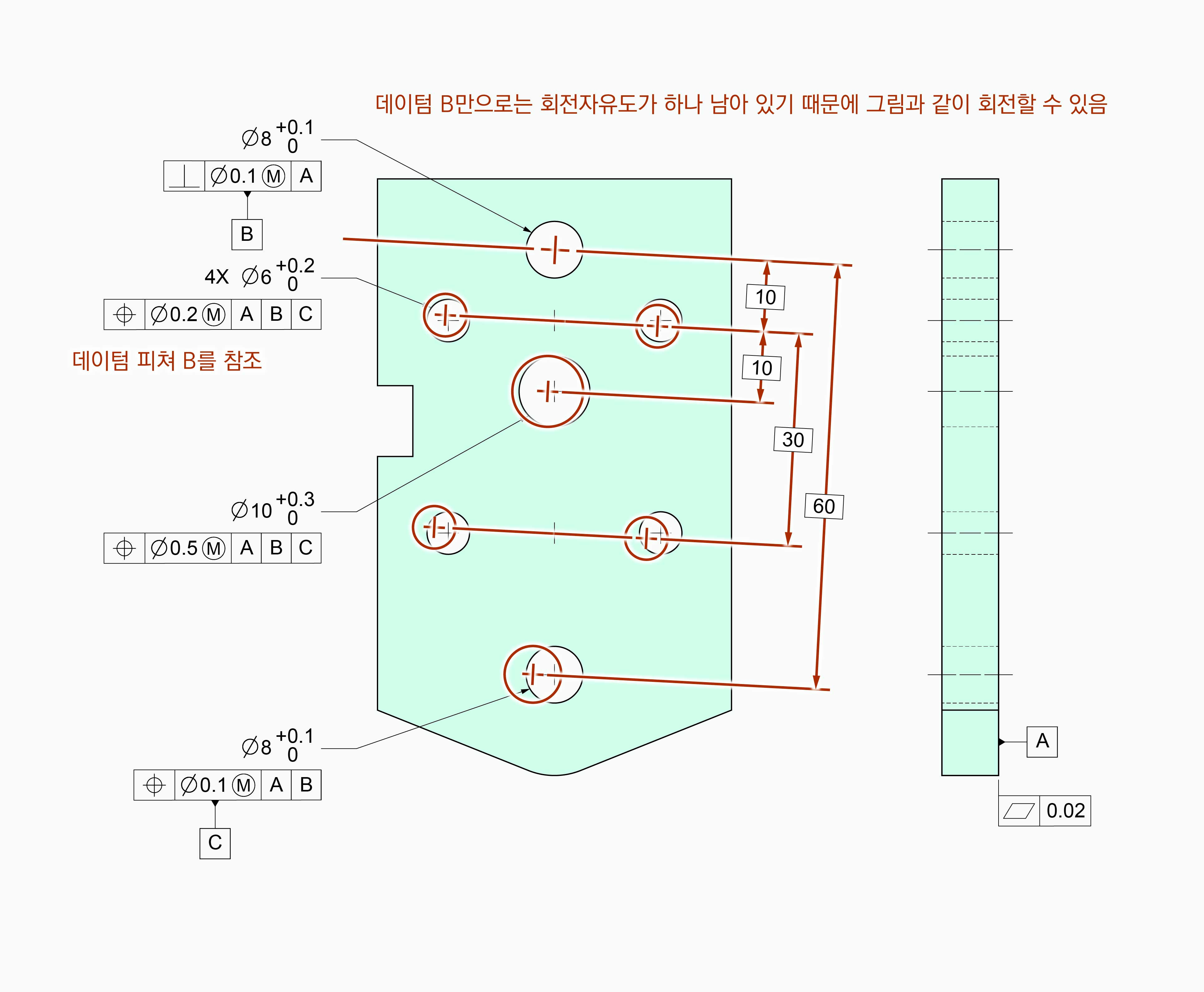 하지만 데이텀 축 B는 회전자유도가 하나 남아 있다. 따라서 데이텀 피쳐 B를 참조한 피쳐들은 수직거리만 통제되고, 이들 사이의 수평거리는 아직 통제되지 않는다. 결과적으로 피쳐들은 데이텀 축 B에 대해 위치가 정의되고 이에 대한 요구사항이 생긴다.
