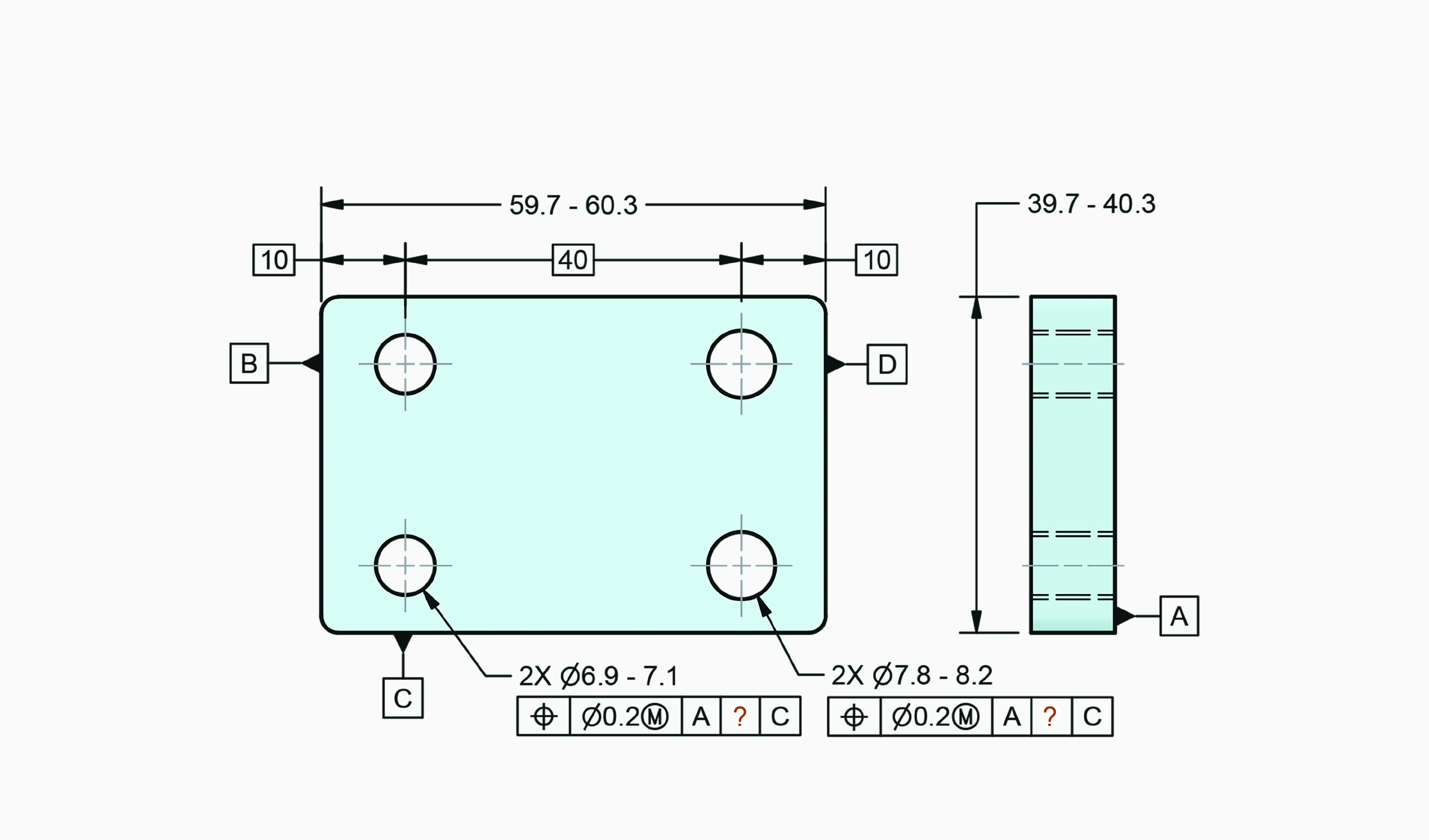 왼쪽의 홀 2개와 오른쪽 홀 2개의 2차 데이텀 피쳐는 데이텀 피쳐 B로 데이텀 피쳐를 동일하게 참조하여 DRF가 동일하게 설정되었다. 이는 보통 왼쪽 홀과 오른쪽 홀이 같은 부품에 조립되는 것을 의미한다.
