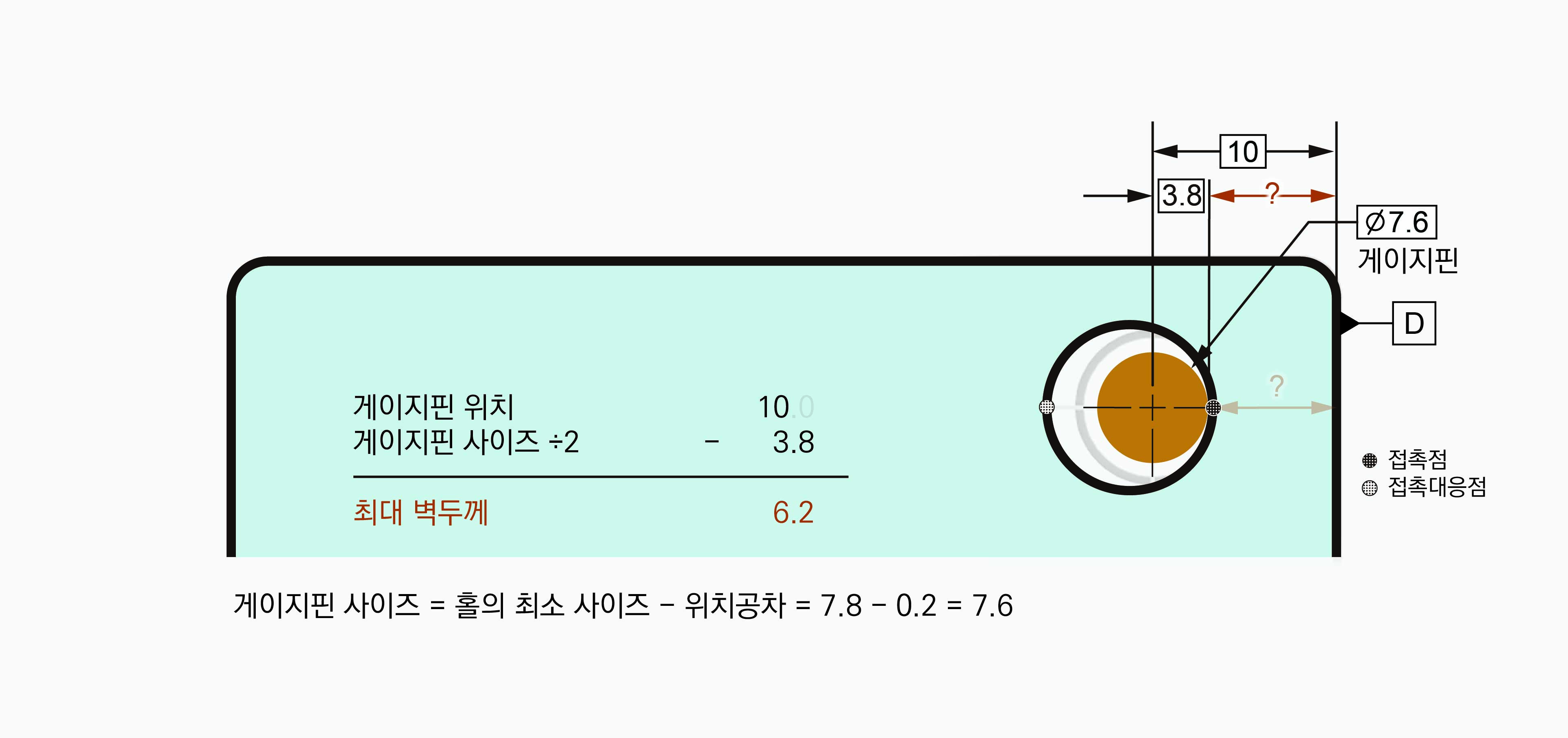 벽두께가 최소가 되는 때는 홀이 벽쪽으로 가장 가깝게 있을 때이다. 홀 안에는 게이지핀이 있어야 한다. 게이지핀 위치는 고정되어 있다. 홀은 게이지핀을 통과할 수 없기 때문에 홀 왼쪽과 게이지핀 왼쪽이 접촉할 때 홀이 벽에서 가장 가깝게 있게 된다. 게이지핀 위치는 고정되어 있기 때문에 이 접촉점 위치도 고정된다. 게이지 핀 위치 10에 게이지핀 사이즈의 반 3.8을 더하면 13.8로 데이텀 D를 기준으로 한 접촉점 위치가 구해진다.