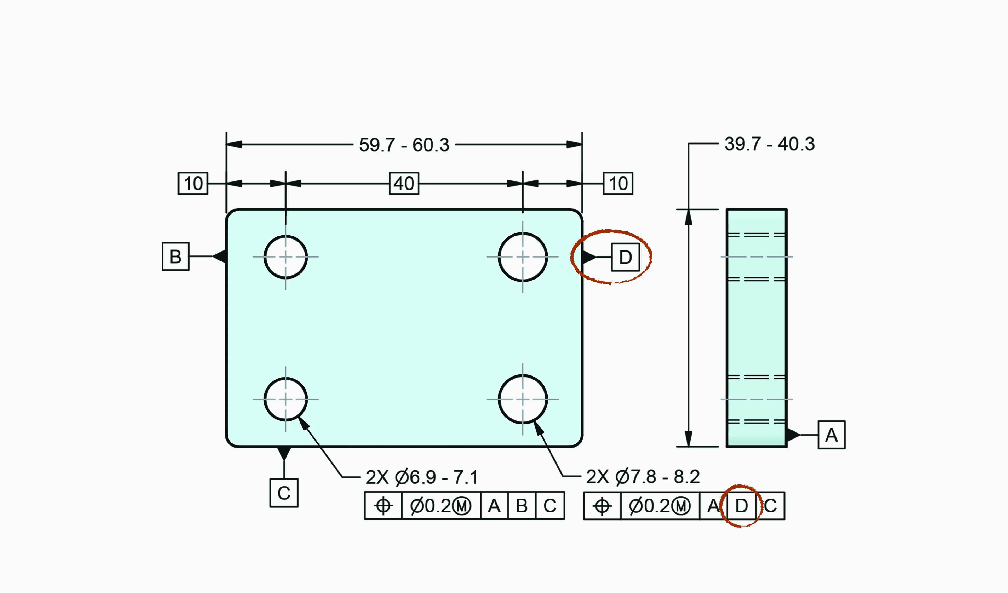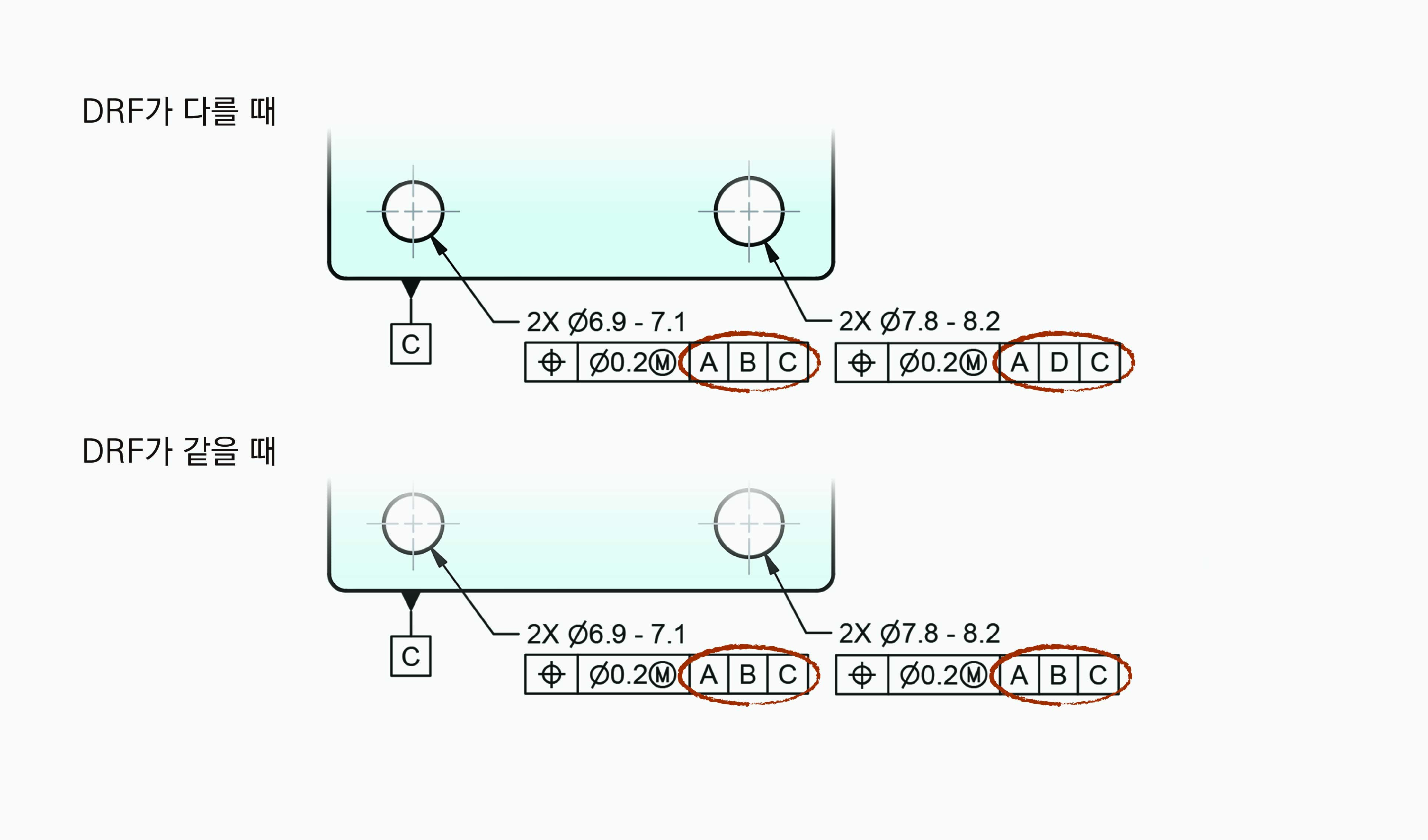 왼쪽 홀 2개의 2차 데이텀 피쳐는 데이텀 피쳐 B이고, 오른쪽 홀 2개의 2차 데이텀 피쳐는 데이텀 피쳐 D로 데이텀 피쳐를 다르게 참조하여 DRF가 다르게 설정되었다. 이는 보통 왼쪽 홀과 오른쪽 홀이 각각 다른 피쳐와 대응하여 조립될 때 이와 같은 DRF를 설정한다.