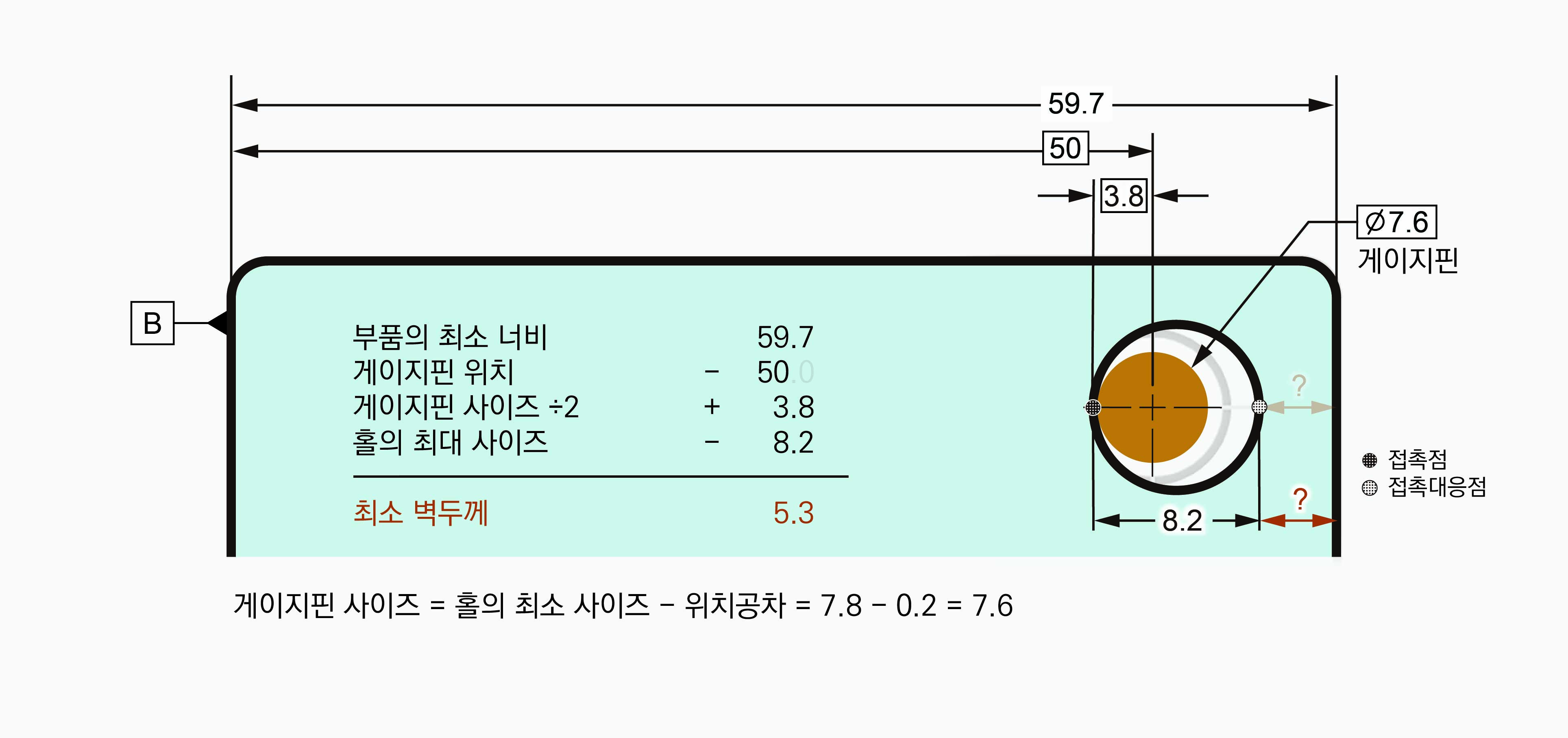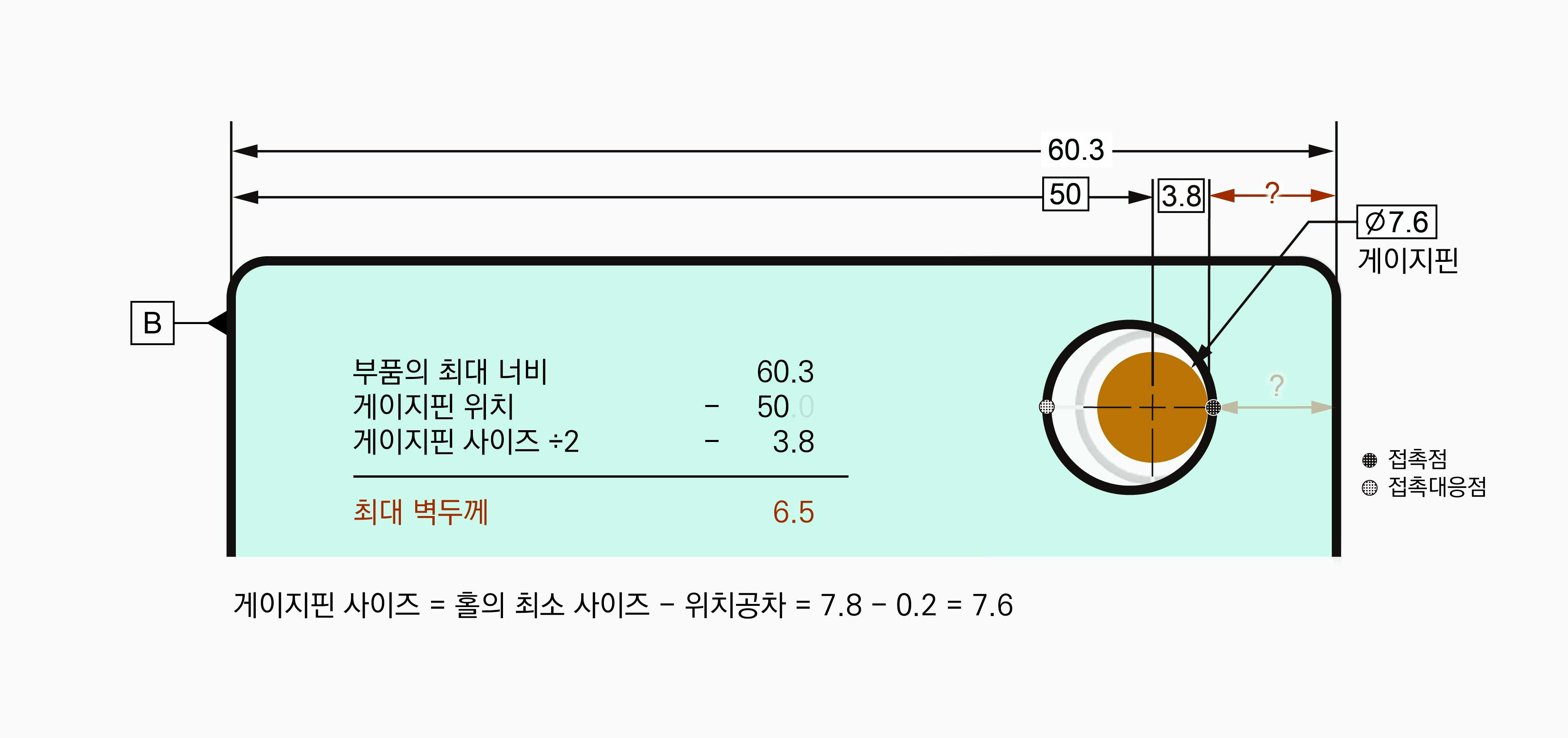 벽두께가 최대가 되는 때는 홀이 벽에서 가장 멀리 있을 때이다. 홀 안에는 게이지핀이 있어야 한다. 게이지핀 위치는 고정되어 있다. 홀은 게이지핀을 통과할 수 없기 때문에 홀 오른쪽과 게이지핀 오른쪽이 접촉할 때 홀이 벽에서 가장 멀리 있게 된다. 게이지핀 위치는 고정되어 있기 때문에 이 접촉점 위치도 고정된다. 게이지핀 위치 50에 게이지핀 사이즈의 반 3.8을 더하면 53.8로 데이텀 B를 기준으로 한 접촉점 위치가 구해진다. 홀이 크든 작든 접촉점 위치는 달라지지 않는다.