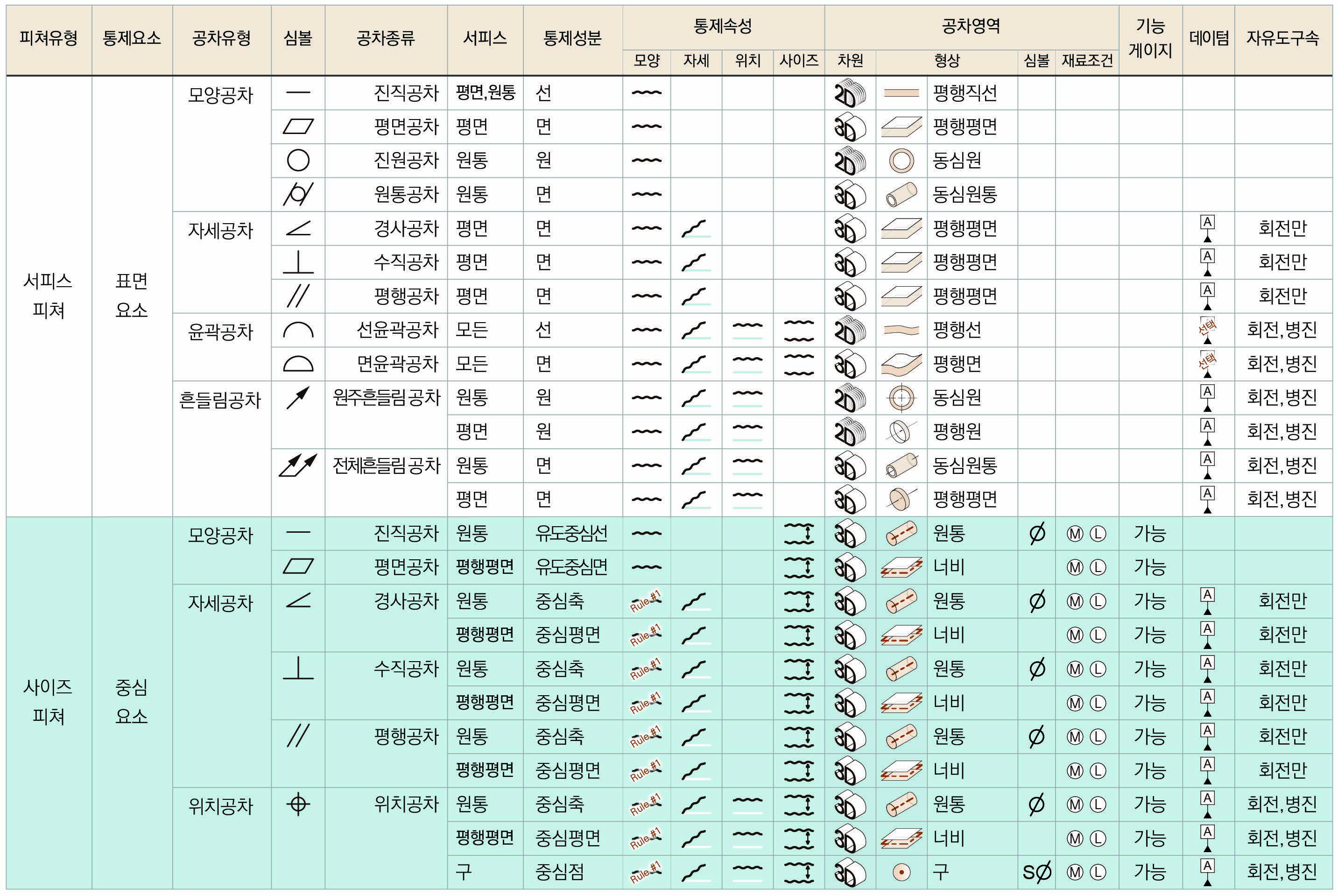 이 요약표에서 가장 큰 특징은 서피스 피쳐와 사이즈 피쳐를 기준으로 나누고 있다는 것이다. 서피스 피쳐를 통제할 때와 사이즈 피쳐를 통제할 때 기하공차 사이의 차이가 두드러지기 때문에 이를 기준으로 요약표를 작성했다.