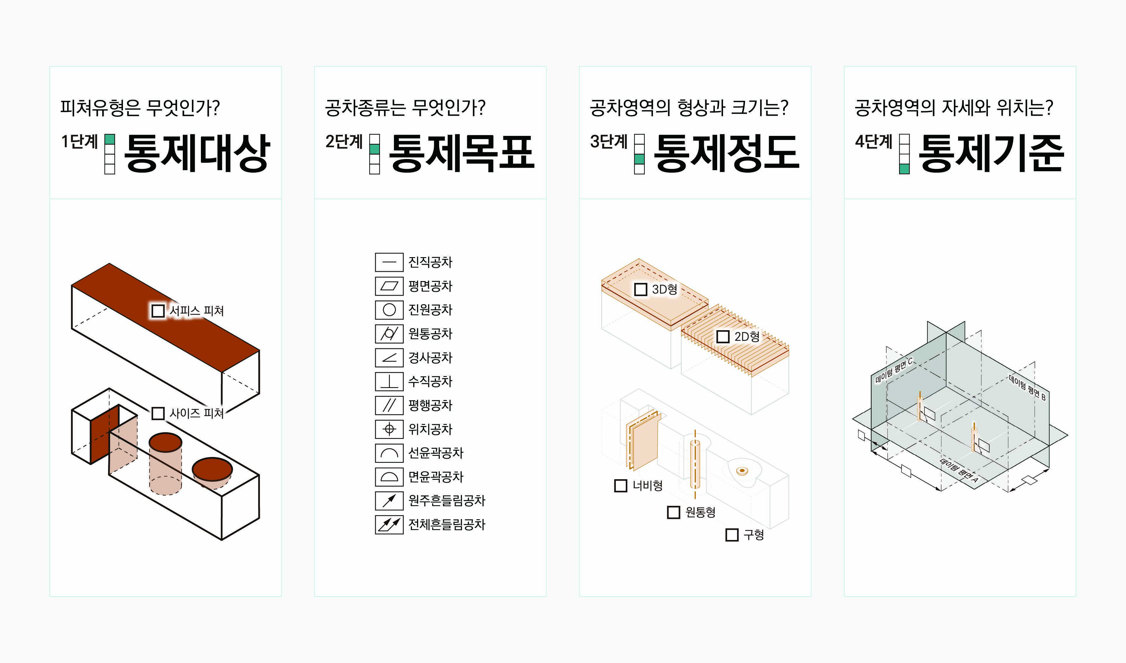 3단계는 통제정도 확인이다. 공차영역의 형상과 크기를 통해 통제대상이 목표 상태에서 얼마나 벗어날 수 있는지 그 허용범위를 확인한다.