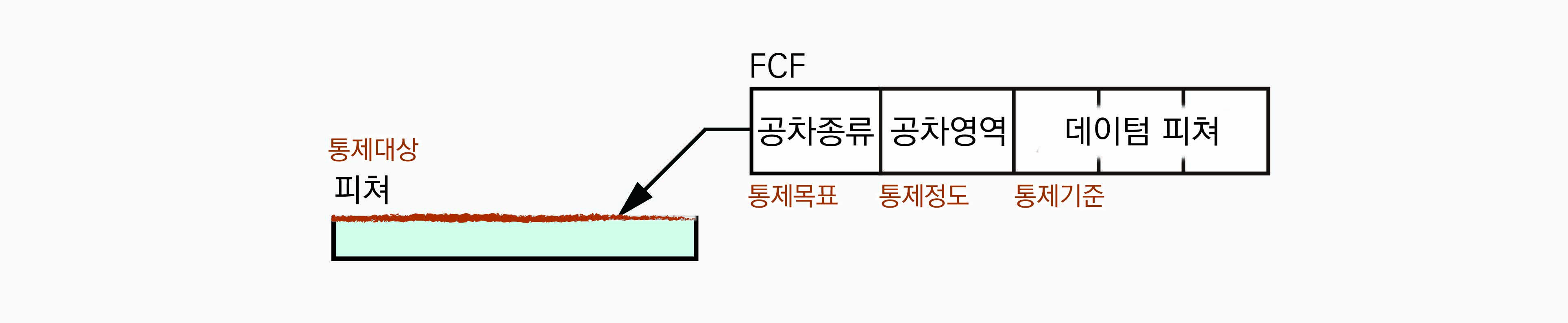 FCF가 지시선으로 지시하고 있는 것은 해당 FCF가 통제하고자 하는 통제대상이 무엇인지 알려준다. 그리고 FCF의 가장 첫번째 부분에 표기된 기하공차를 나타내는 심볼은 통제대상이 목표로 하는 기하학적 상태가 무엇인지 알려준다. 그리고 FCF의 다음 두번째 부분은 통제대상이 어느 정도로 통제되어야 하는지 통제정도를 공차영역의 형상과 크기로 알려준다. 그리고 FCF의 나머지 부분은 참조한 데이텀 피쳐를 통해 해당 FCF로 통제할 때 무엇을 기준으로 통제해야 하는지를 알려준다.